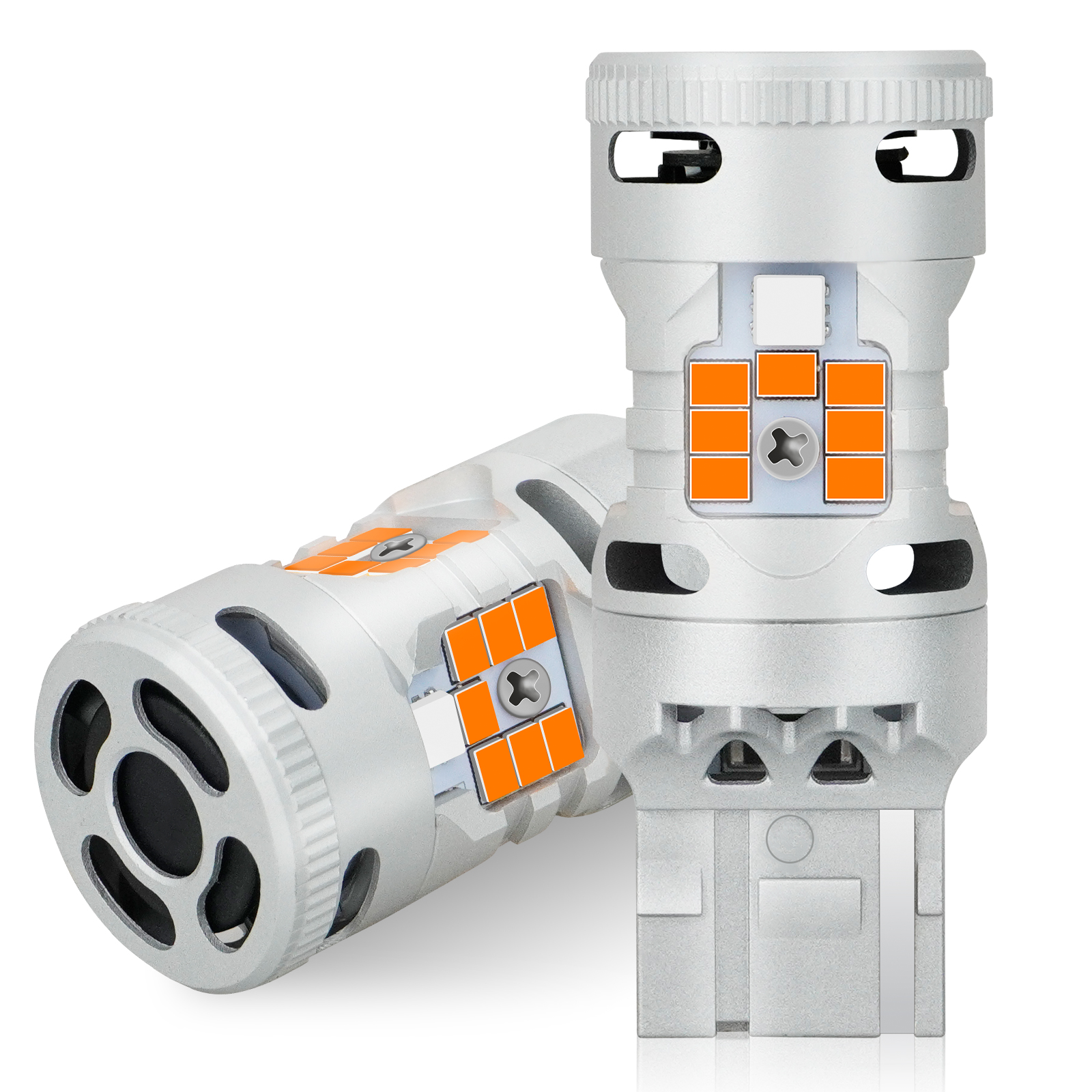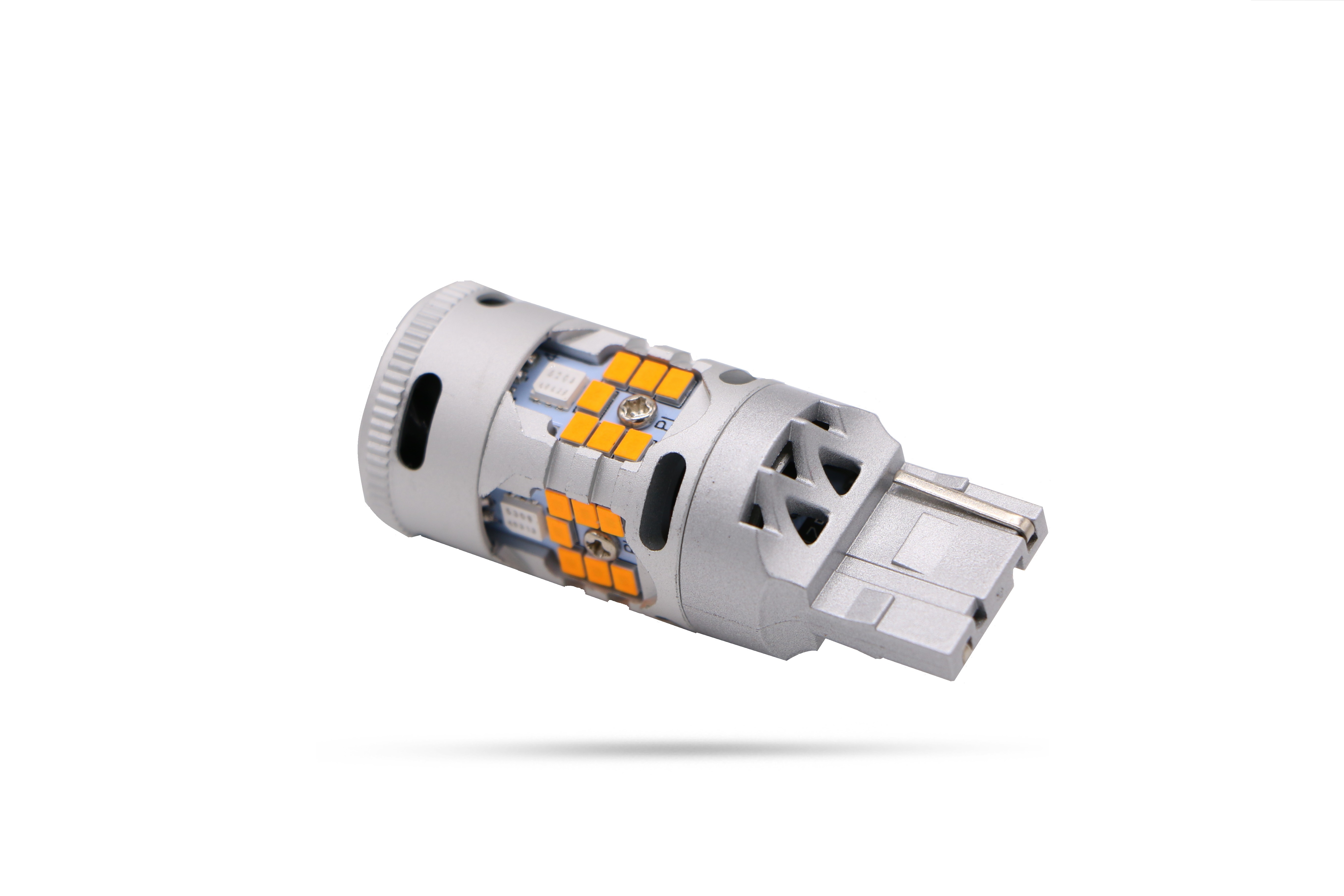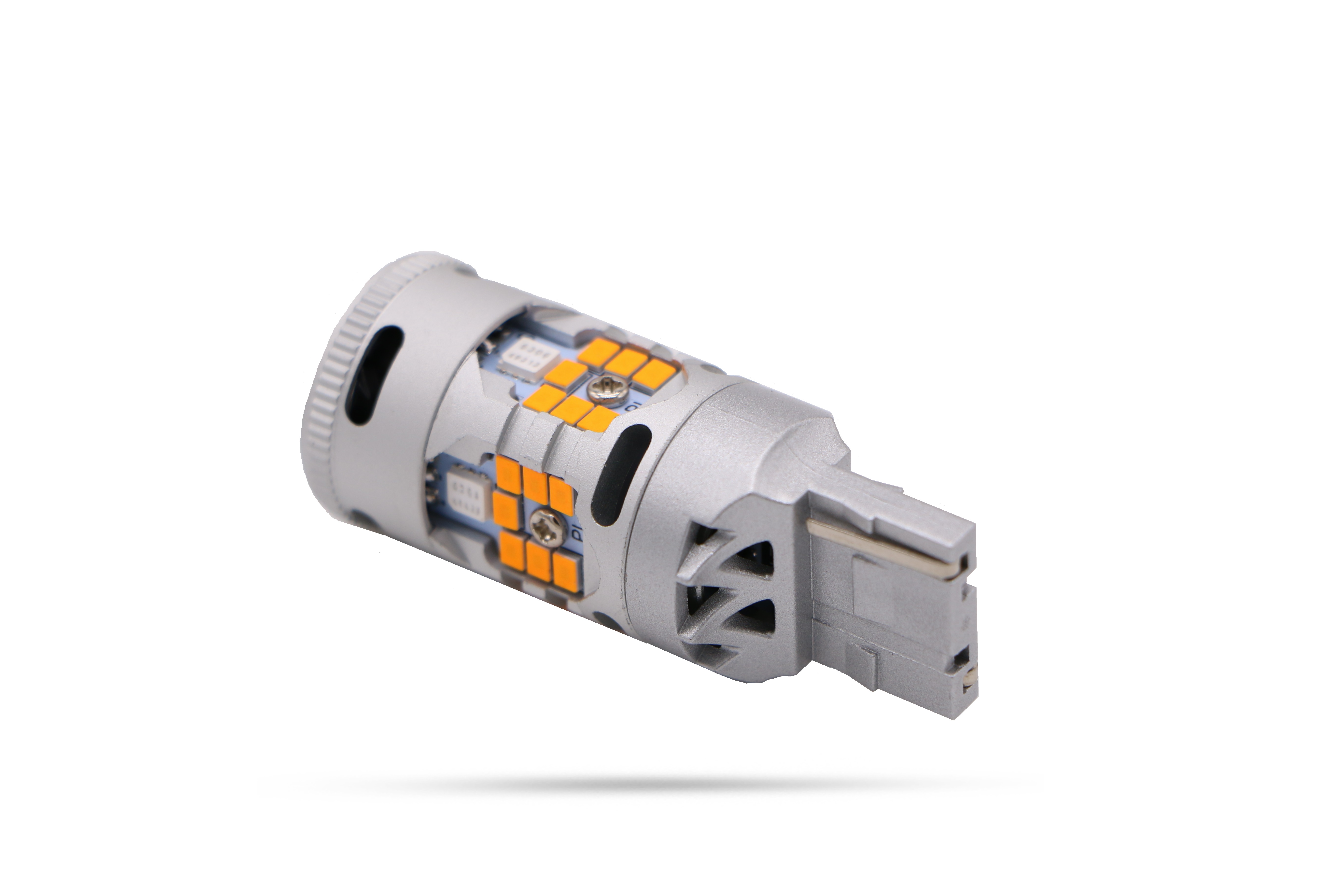 Die Nachfrage nach Plug´n Play LED Leuchtmittel die in allen Fahrzeugen so ohne weiteres funktionieren ist stetig hoch. Die Fahrzeughersteller verwenden aber weiterhin unterschiedliche Systeme, die die Leuchtmittel unterschiedlich sensibel überwachen/kontrollieren. Während der Großteil mit einem Toleranzbereich in der Reallast arbeitet, gibt es aber auch Hersteller bei denen diese Toleranz gegen null geht. Somit ist es hier unausweichlich mit einer identischen Stromaufnahme zu arbeiten, damit keine lästige Fehlermeldung kommt. In der Vergangenheit und auch aktuell haben wir dies mithilfe unserer verschiedenen seperaten Widerstandslösungen praktisch realisiert. Die Nutzung von seperaten Widerstände ist eine technisch dauerhaft und empfehlenswerte Lösung. Leider aber weniger attraktiv in Bezug auf die Installation, da der Anschluss dieser über die Zuleitungen erfolgt. Wir haben daher bei dieser neuen 28er SMD Serie die maximal zu verbauende Größe interner Widerstände untergebracht, diese Widerstände müssen konstruktionsbedingt aktiv gekühlt werden. Die Kühlung erfolgt durch einen kleinen integrierten Lüfter der die im Scheinwerfer befindliche Umgebungsluft nutzt, um die Widerstände und LED Chips konstant auf der richtigen Betriebstemperatur zu halten. Die Kühlung erfolgt korpusintern durch einen oben montierten Aufbau der vom Mittelpunkt heraus kühlt. Um dem Mittelpunkt herum sind 4 LED Leuchtflächenbreiche im 90° Winkel zueinander angeordet, pro Fläche sind 7xCSP Chips verbaut, somit in der Summe 28 LED Chips. Der Lichtort wurde auch bei dieser Serie bewusst so gewählt, wo auch original der Wolframdraht das Licht in den Reflektor einspeißt. Durch die Positionierung und massive Leuchtkraft der Chips außen, hat es keinerlei negative Auswirkungen das auf dem LED Kopf frontal keine Chips verbaut sind.