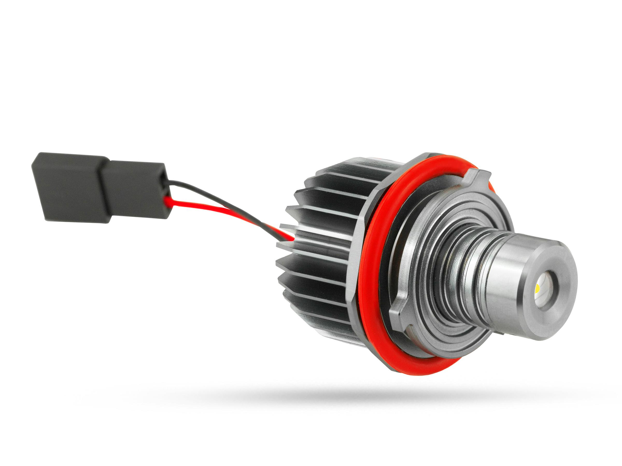 Diese Angel Eye Brenner benötigen im Vergleich zu dem Vorgängerprodukt keinen Reflektor mehr vor dem CREE® LED Chip. Dieser erzeugt an der Lichtaufnahme des Xenonscheinwerfers ein so hohes Maß an Lichtleistung das der Reflektor nicht mehr verbaut werden musste. Auch dieses neue LED Angel Eye Modul ist abgesehen von der Halterung auch aus einem Aluminiumblock gefräst, wodurch sich die perfekte Wärmeableitung realisieren lässt. Die Haltbarkeit dieser CREE® Chips ist stark von der Ableitung der entstehenden Wärme abhängig. Dadurch das hier die angesprochene Ableitung nahezu perfekt umgesetzt ist, konnte die Haltbarkeit weiter verbessert werden. Der dritte Vorteil dieses neuen Produktes ist, dass keine Vorschaltgeräte mehr benötigt werden. Alle Elektronikbauteile, welche zu Fehlerunterdrückung und zur Vermeidung einer Radiostörung benötigt werden, sind schon in dem Aluminiumgehäuse integriert.