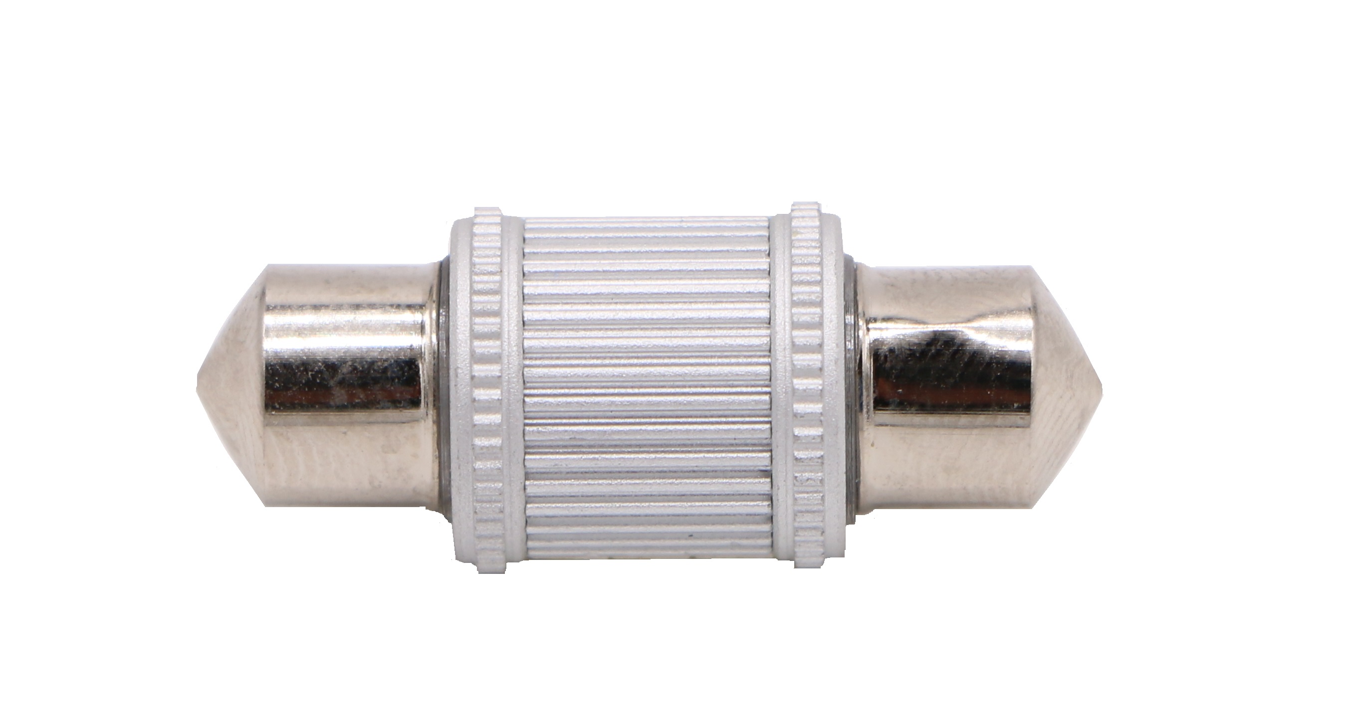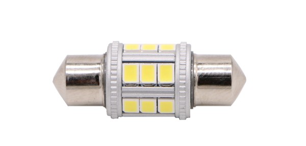 Dieses LED Leuchtmittel ist mit 9 2835 SMD LED Chips ausgestattet, die durch Ihre seitliche Anordnung in 3 Reihen ein äußerst homogenes Lichtbild erzeugen. Hierraus resultiert eine Kompatibilität mit jedem originalen Reflektor. Der ausgeleuchtete Bereich liegt bei ca.180°, die Rückseite der Soffitte ist mit dem Kühlkörper für die statische Kühlung ausgestattet. Das relevante Abstrahlverhalten entspricht somit einer originalen Halogensoffitte. Auch in diesem LED Leuchtmittel sind integrierte Widerstände gegen die lästige Fehlermeldung oder Nachglimmen verbaut. Konstruktionsbedingt konnten wir die integrierten Widerstände aber nicht beliebig groß dimensionieren, die Stromaufnahme liegt bei 0,14A.