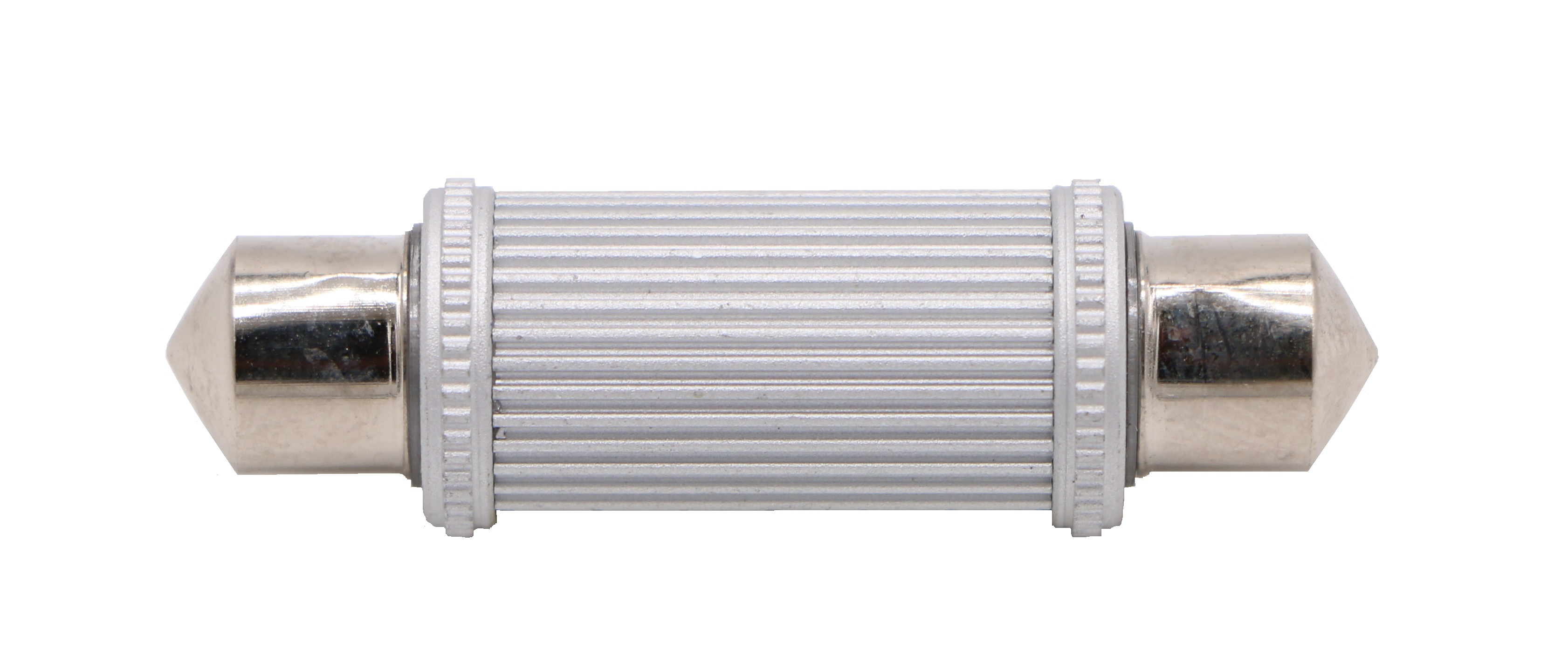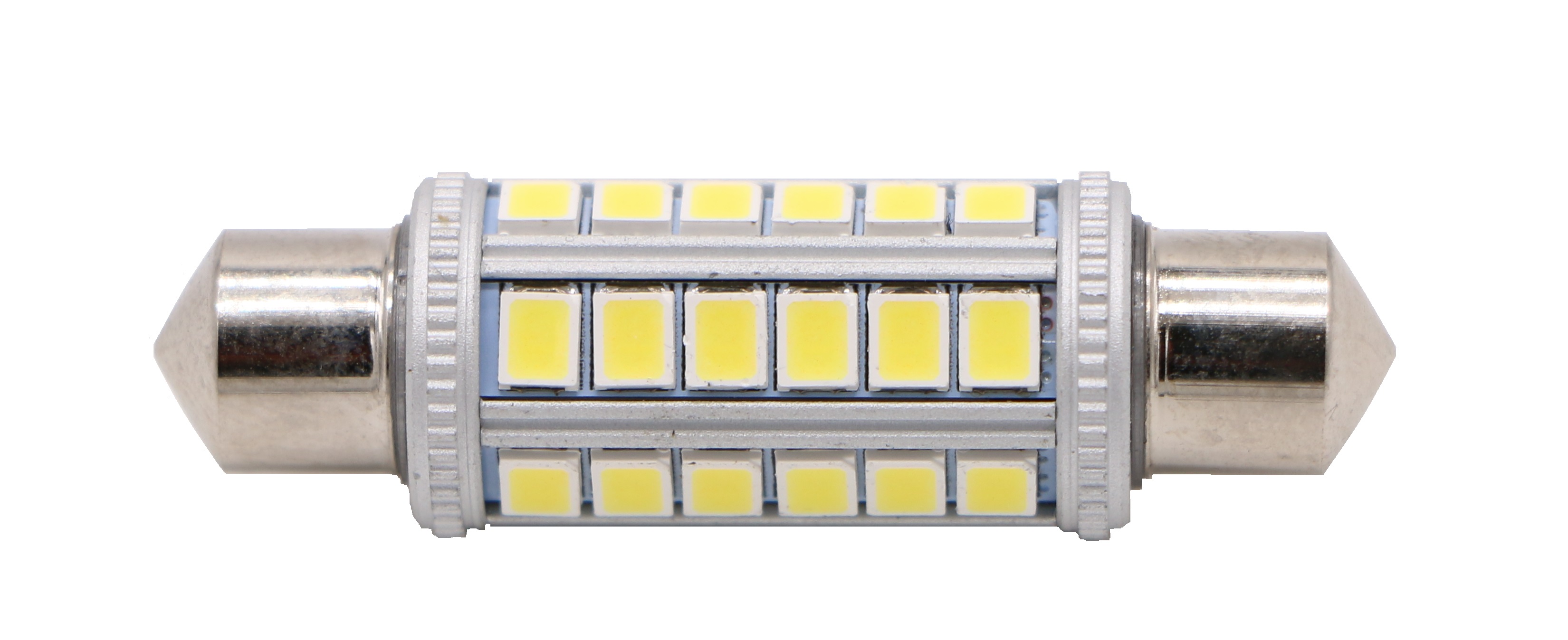 Dieses LED Leuchtmittel ist mit 18 2835 SMD LED Chips ausgestattet, die durch Ihre seitliche Anordnung in 3 Reihen ein äußerst homogenes Lichtbild erzeugen. Hierraus resultiert eine Kompatibilität mit jedem originalen Reflektor. Der ausgeleuchtete Bereich liegt bei ca.180°, die Rückseite der Soffitte ist mit dem Kühlkörper für die statische Kühlung ausgestattet. Das relevante Abstrahlverhalten entspricht somit einer originalen Halogensoffitte. Auch in diesem LED Leuchtmittel sind integrierte Widerstände gegen die lästige Fehlermeldung oder Nachglimmen verbaut. Konstruktionsbedingt konnten wir die integrierten Widerstände aber nicht beliebig groß dimensionieren, die Stromaufnahme liegt bei 0,14A.