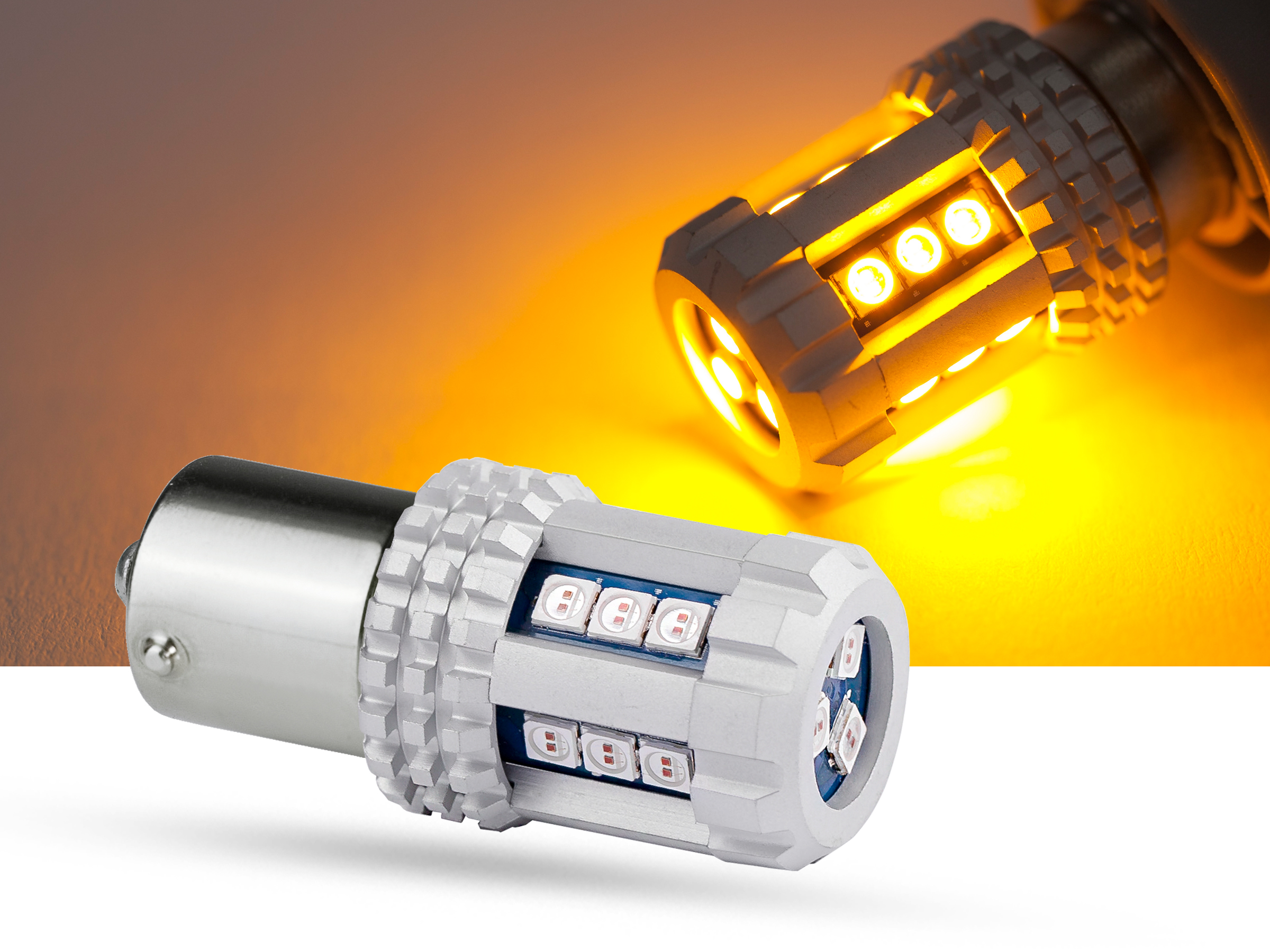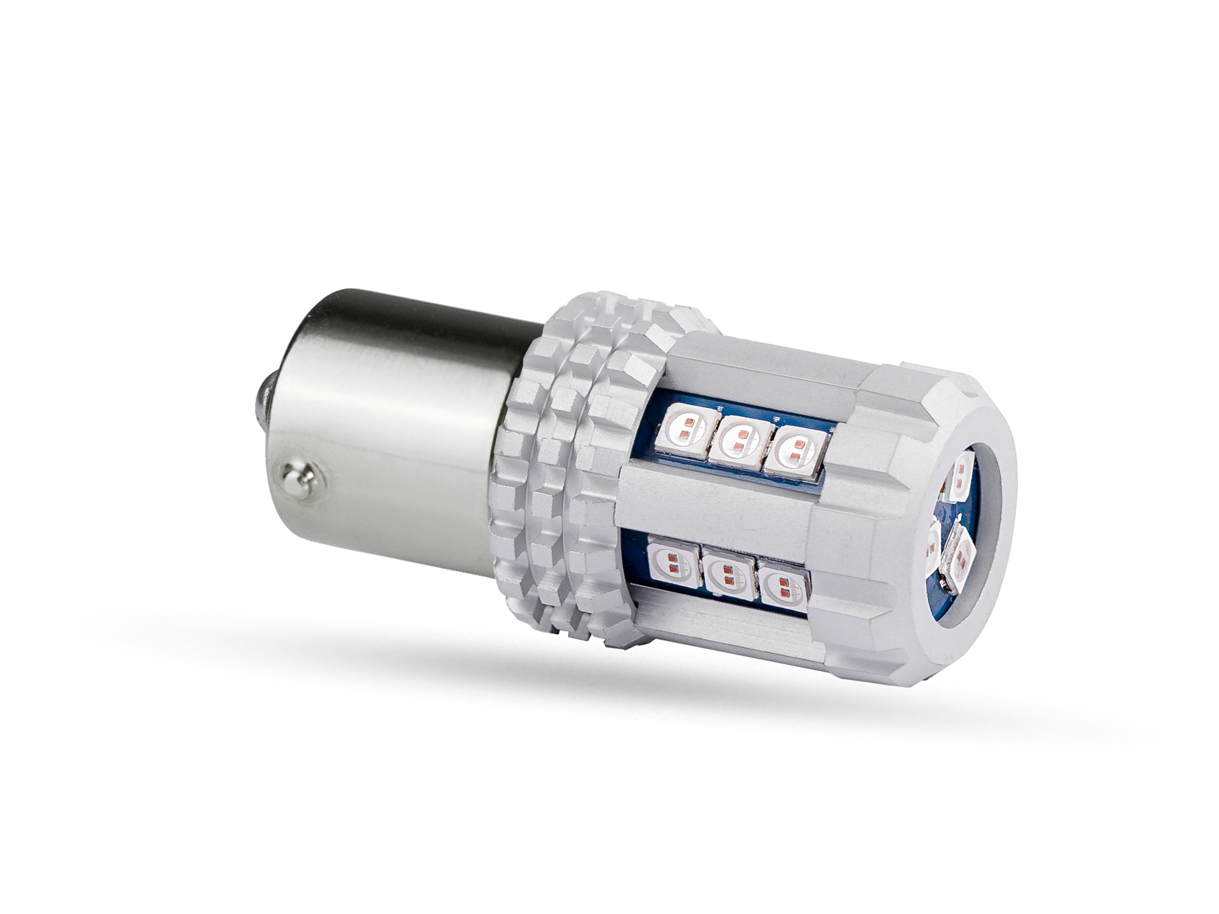 Auf diesem sehr kompakt gestalteten LED Korpus nutzen wir 18 3030 SMD Chips von denen 15 Stück rundherum und 3 Stück oben auf dem Kopf angeordnet sind. Durch diese gleichmäßige Verteilung lässt sich in nahezu jedem Reflektor ein homogen ansprechendes Lichtbild erzeugen. Neben den LEDs nutzen wir in dieser Serie eine intelligente Steuerelektronik mit u.a. integrierten Widerständen, die die reale Stromaufnahme erhöhen und die entstehende Wäre über den Aluminiumrahmen an die Umgebungsluft abgeben. In der Summe liegt die Wärmeentwicklung unter dem Niveau der originalen R10W oder R5W.