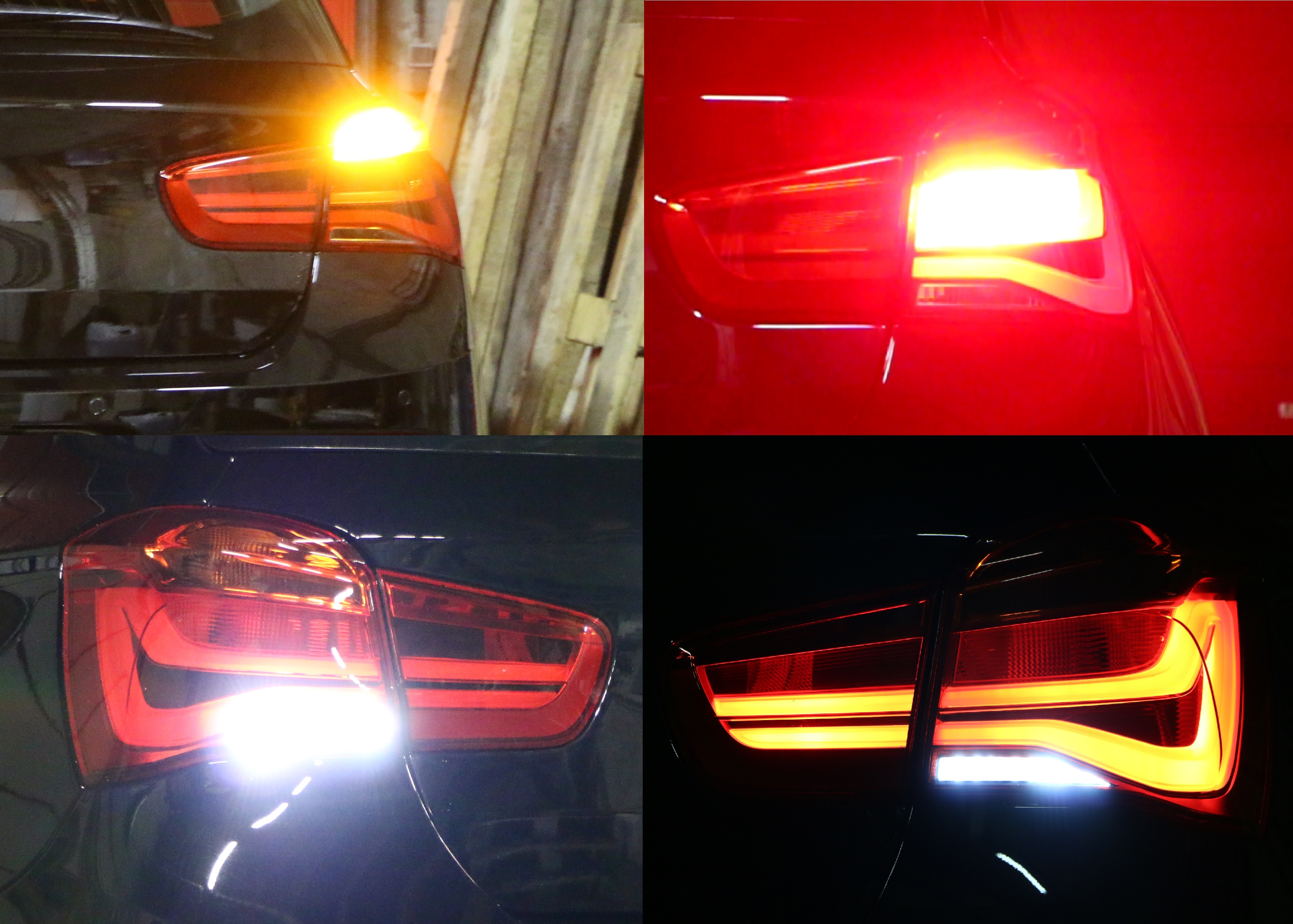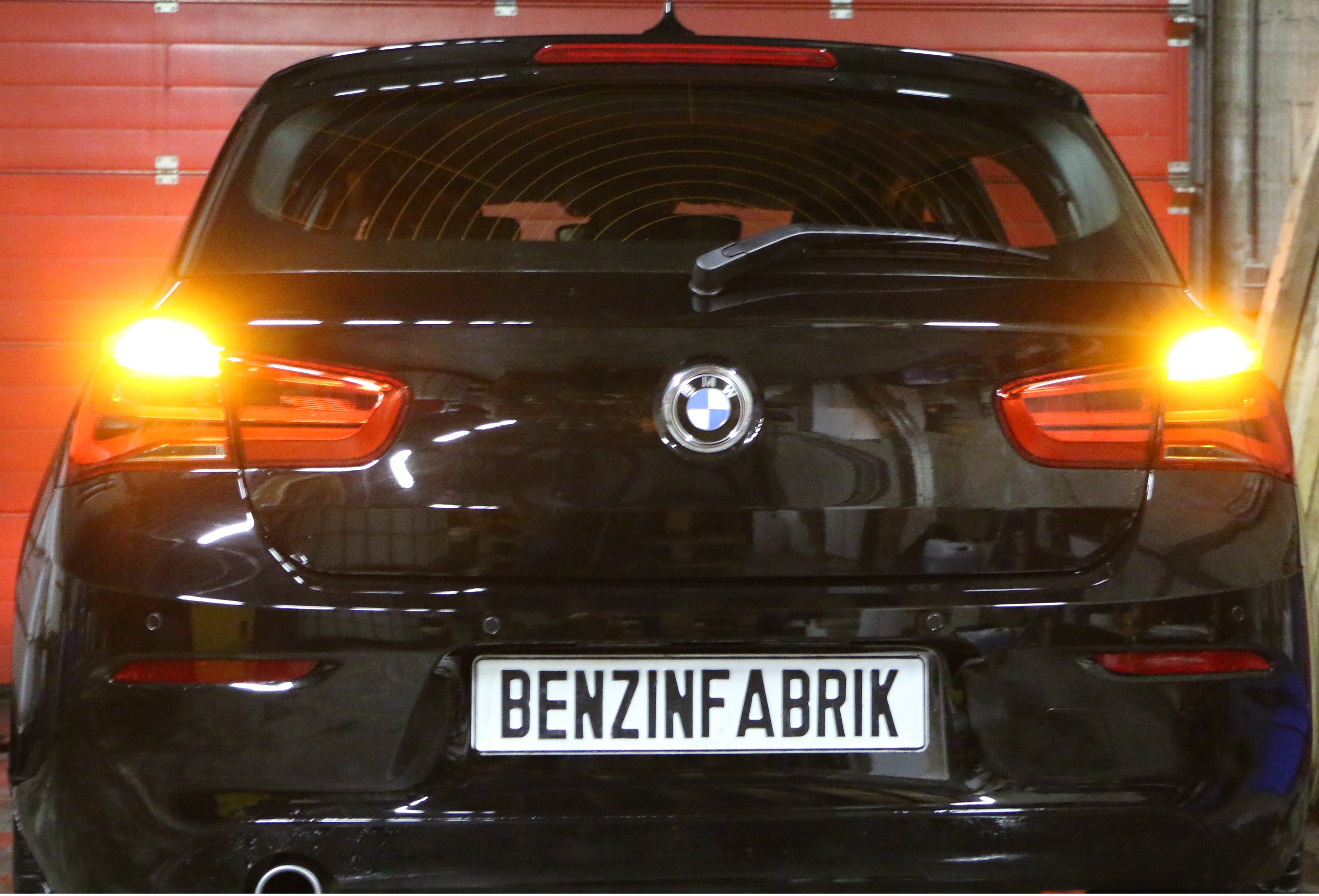 Dieses Set dient zur Umrüstung der kompletten originalen Rückleuchten des BMW 1er F20 LCI Facelift, es werden alle original verbauten Halogenleuchtmittel gegen die PKD V2.0 Version ausgetauscht. Durch den Austausch werden wird ein wesentlich besseres Lichtergebnis erzielt. Der ausgeleuchtete Bereich und die Lichtfarbe des Rückfahrscheinwerfers wird auf das maximal mögliche gesteigert. Original sind in den Rückleuchten neutral gelbe/orange Blinker verbaut, wir nutzen in diesem Set schon orange leuchtende LED Leuchtmittel, hieraus resultiert ein wesentlich kräftigeres farbliches Blinken. Durch den Austausch der insgesamt 2 Bremslichtleuchtmittel gegen rote LEDs bekommt das Bremslicht wieder eine richtig kräftig rote Farbe und einen komplett ausgeleuchteten Reflektor, zusätzlich hierzu ist das Ansprechverhalten der LEDs perfekt. Die originalen Auf- und Abglimmphasen fallen weg, die LEDs sind direkt zu 100% an bzw. aus.  Natürlich kommt es in Kombination mit der Faceliftausführung zu keinerlei Problemen mit dem Bordcomputer, kein Aufblitzen oder Fehlermeldung.