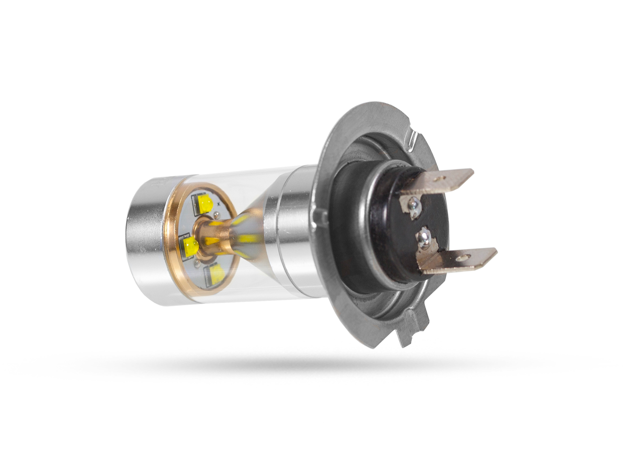 Durch die Anordnung der vier Chips welche nach hinten auf den Reflektorkegel leuchten und die zwei Chips auf dem LED Kopf, ist ein sehr homogenes Abstrahlverhalten gewährleistet. Das Reflektorgehäuse wird aufgrund dessen optimal mitgenutzt und dieses LED Leuchtmittel kann dadurch in nahezu jedem Reflektor ein perfektes Lichtergebnis erzielen. Zusätzlich wurden die nach hinten strahlenden LEDs zum Schutz mit Plexiglas verkleidet. Sie eignen sich zum Beispiel ideal als Tagfahrlicht oder Rückfahrscheinwerfer für Offroad- und Rennsportzwecke.