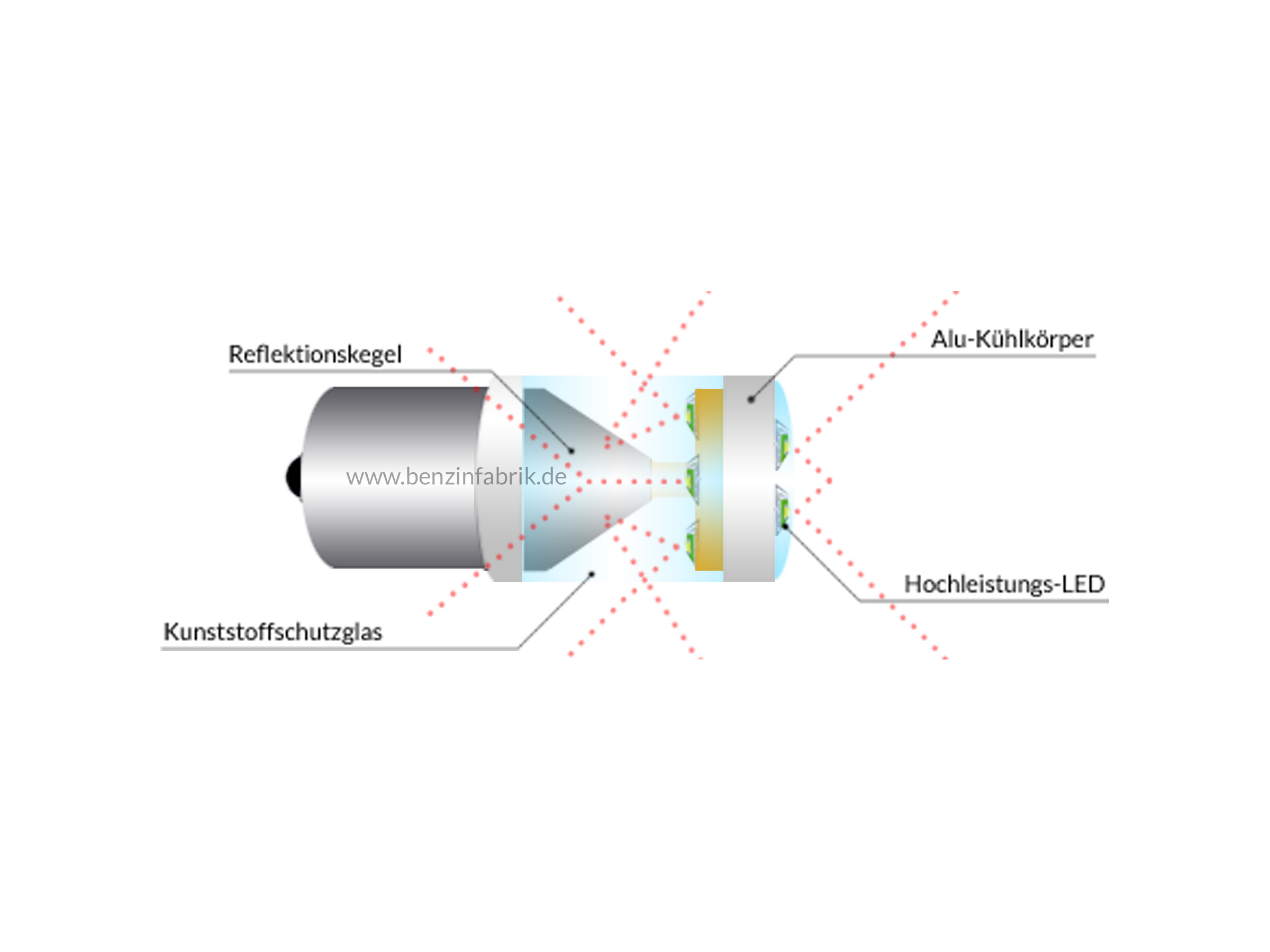Durch die Anordnung der vier Chips welche nach hinten auf den Reflektorkegel leuchten und die zwei Chips auf dem LED Kopf, ist ein sehr homogenes Abstrahlverhalten gewährleistet. Das Reflektorgehäuse wird aufgrund dessen optimal mitgenutzt und dieses LED Leuchtmittel kann dadurch in nahezu jedem Reflektor ein perfektes Lichtergebnis erzielen. Zusätzlich wurden die nach hinten strahlenden LEDs zum Schutz mit Plexiglas verkleidet.