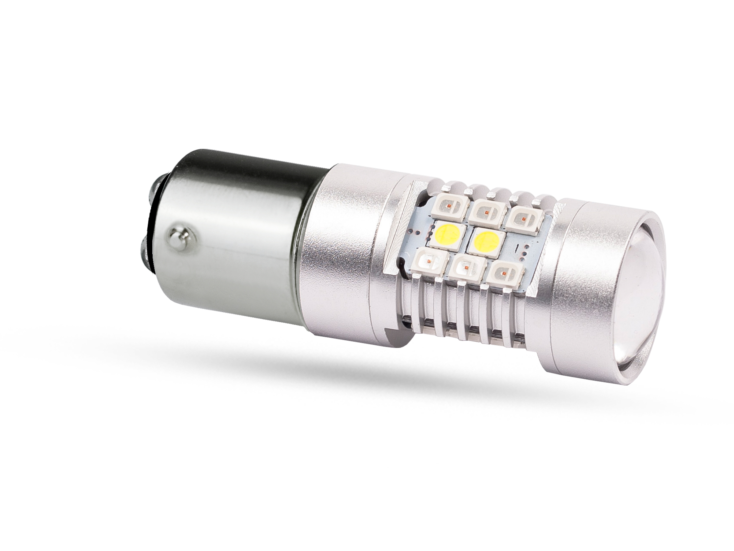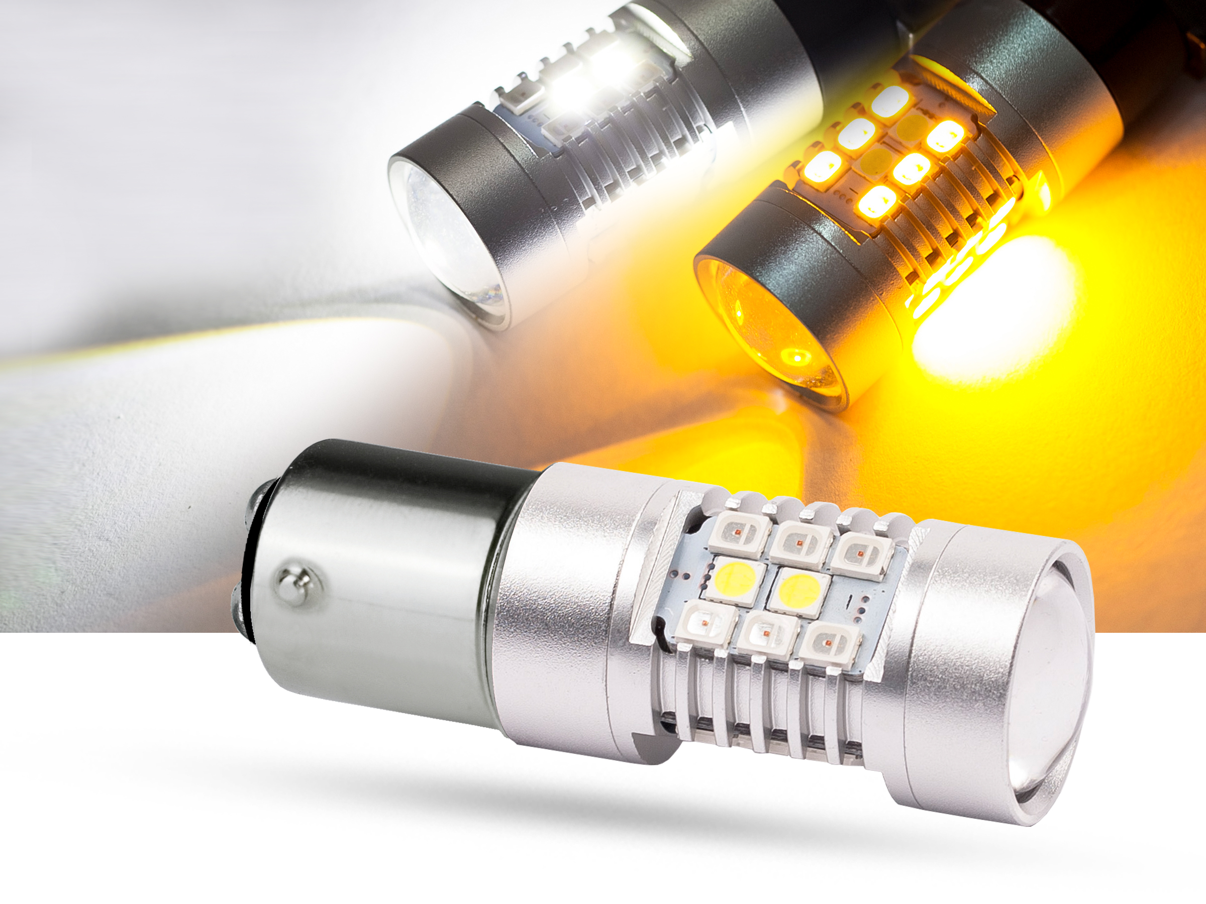28er Bi-color SMD LED zur Umrüstung der originalen 21/5W Bay15d Halogenlampe. Original wird dieser Typ als Tagfahrlicht kombiniert mit Blinker genutzt. Die Tagfahrlichtstufe leuchtet abgedimmt dauerhaft und sobald der Blinker eingeschaltet wird leuchtet die Blinkerstufe mit voller Lichtleistung. Optisch wenig ansprechend ist das gelbliche Stand-/Tagfahrlicht und der träge Blinker. Umkompliziert wird die originale Glühlampe durch unsere LED ersetzt und das Tagfahrlicht leuchtet reinweiß und heller. Sobald die Blinkerstufe bestromt wird, schalten sich die weißen LEDs ab und die gelben leuchten. Wenn die Bestromung des Blinkers beendet ist, läuft eine interne Verzögerung damit das Weiß nicht zwischen den Blinkzyklen leuchet, und springt erst dann wieder in den reinweißen Tagfahr- bzw. Standlichtmodus.