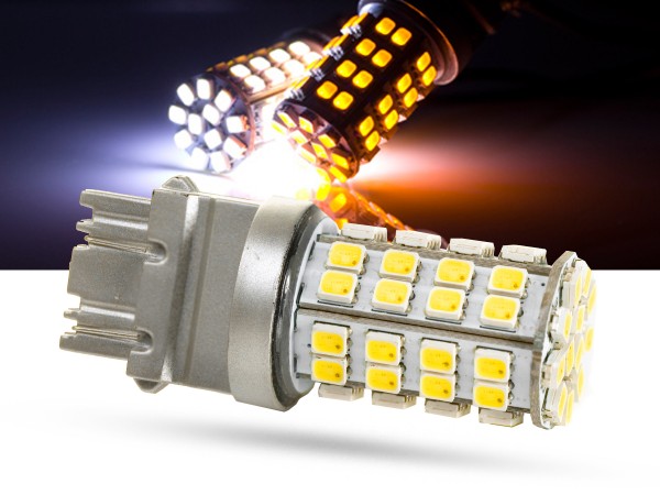 Der große Vorteil dieser LED ist das zwei Lichtstufen unterstützt werden. Zum einen die 7 Watt Standlichtfunktion in weiss, sowie auch die 27 Watt Blinkfunktion in orange. Bei diesen Produkt leuchten alle verbauten SMD Chips in beiden Farben. Es gibt zum Beispiel andere Angebote wo 30 SMD Chips verbaut sind, wovon 15 in orange und 15 in weiss leuchten. Nicht so bei diesem Produkt, hier leuchten alle 60 Chips in beiden Farben.