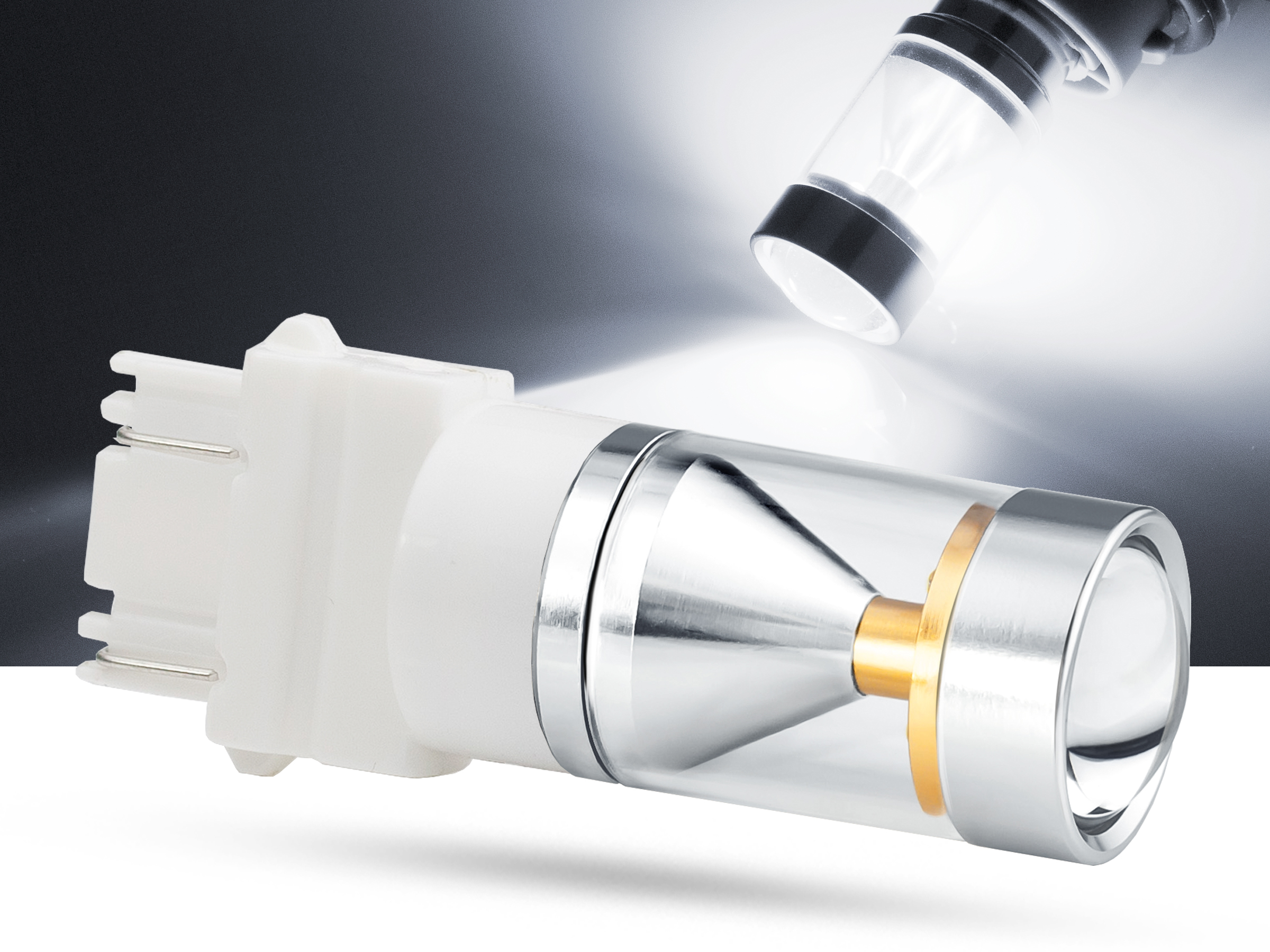Durch die Anordnung der vier Chips welche nach hinten auf den Reflektorkegel leuchten und die zwei Chips auf dem LED Kopf, ist ein sehr homogenes Abstrahlverhalten gewährleistet. Das Reflektorgehäuse wird aufgrund dessen optimal mitgenutzt und dieses LED Leuchtmittel kann dadurch in nahezu jedem Reflektor ein perfektes Lichtergebnis erzielen. Zusätzlich wurden die nach hinten strahlenden LEDs zum Schutz mit Plexiglas verkleidet. Sie eignen sich zum Beispiel ideal als Tagfahrlicht oder Rückfahrscheinwerfer für Offroad- und Rennsportzwecke.