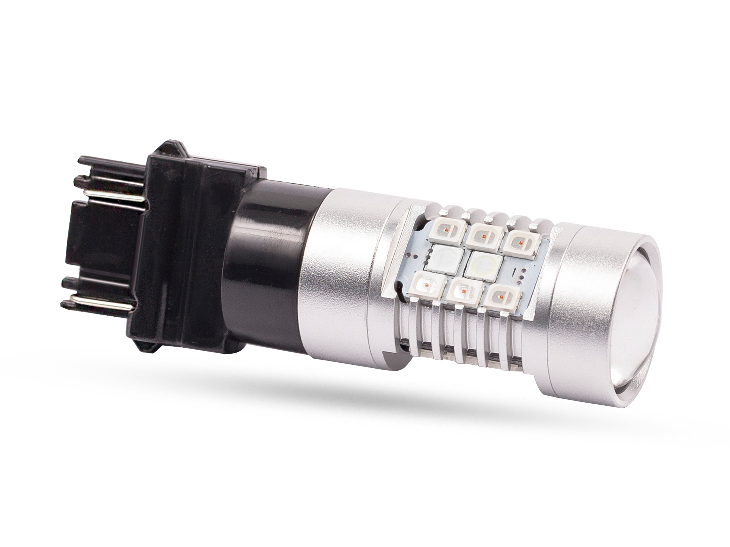 28er Bi-color SMD LED zur Umrüstung der originalen 27/7W 3157 Halogenlampe. Original wird dieser Typ als Rücklicht kombiniert mit Blinker genutzt. Die Rücklichtstufe leuchtet abgedimmt dauerhaft und sobald der Blinker eingeschaltet wird leuchtet die Blinkerstufe mit voller Lichtleistung. Optisch wenig ansprechend ist das schwache meist leicht pink wirkende Rücklicht und der träge Blinker. Umkompliziert wird die originale Glühlampe durch unsere LED ersetzt und das Rücklicht leuchtet in intensivem rot und heller. Sobald die Blinkerstufe bestromt wird, schalten sich die roten LEDs ab und die gelben leuchten. Wenn die Bestromung des Blinkers beendet ist, läuft eine interne Verzögerung damit das rot nicht zwischen den Blinkzyklen leuchet, und springt erst dann wieder in den roten Rücklichtmodus.