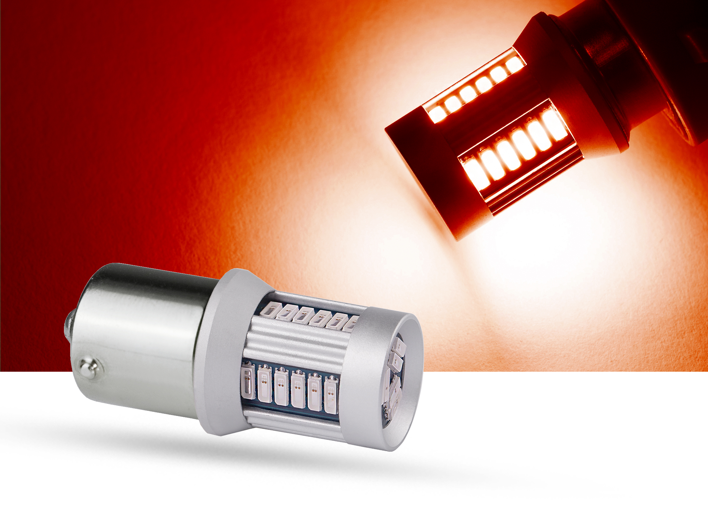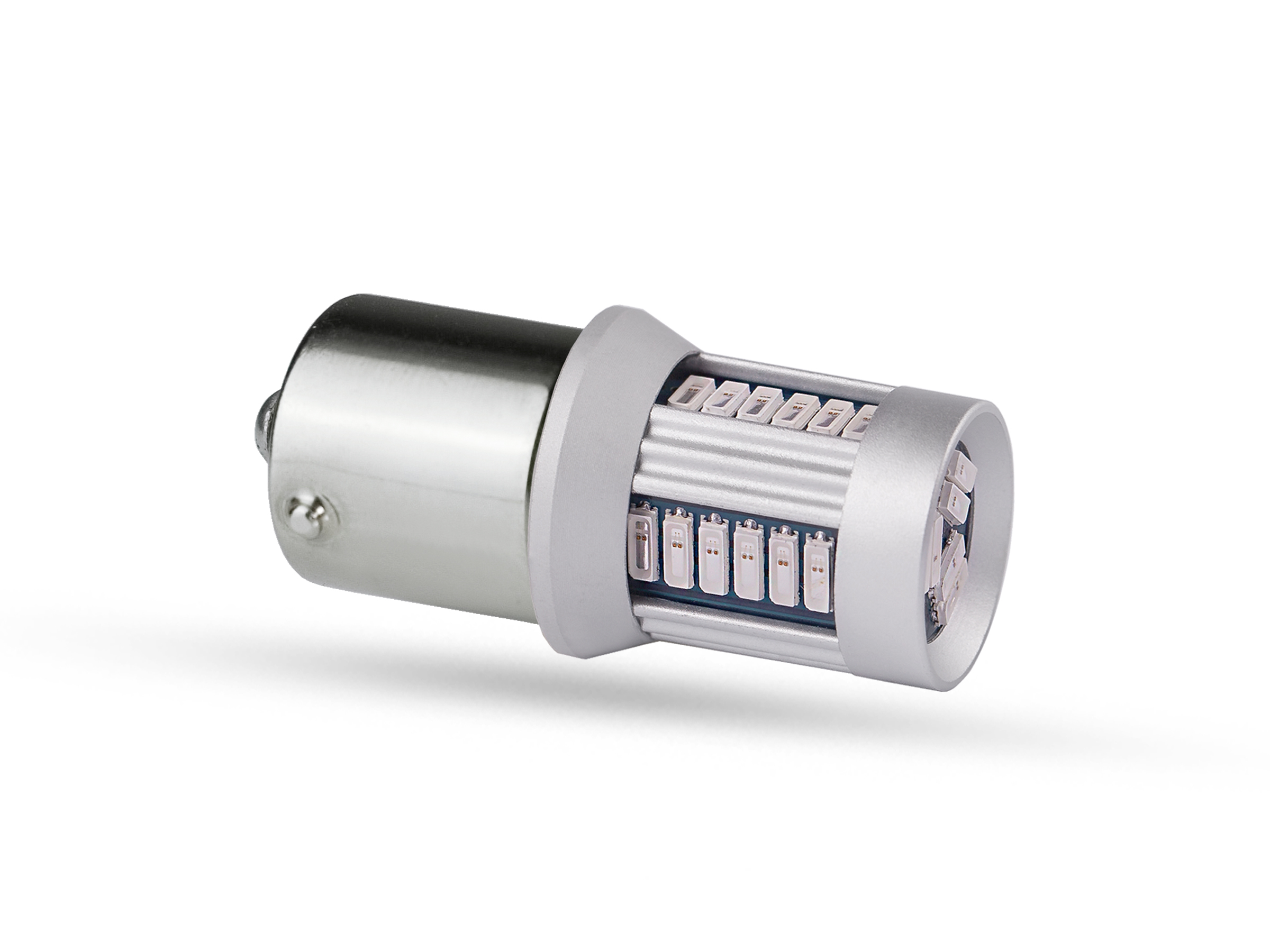 Auf diesem sehr kompakt gestalteten LED Korpus nutzen wir 30 4014 SMD Chips von denen 24 Stück rundherum und 6 Stück oben auf dem Kopf angeordnet sind. Durch diese gleichmäßige Verteilung lässt sich in nahezu jedem Reflektor ein homogen ansprechendes Lichtbild erzeugen. Neben den LEDs nutzen wir in dieser Serie eine intelligente Steuerelektronik mit u.a. integrierten Widerständen, die die reale Stromaufnahme erhöhen und die entstehende Wäre über den Aluminiumrahmen an die Umgebungsluft abgeben. In der Summe liegt die Wärmeentwicklung unter dem Niveau der originalen R10W oder R5W.